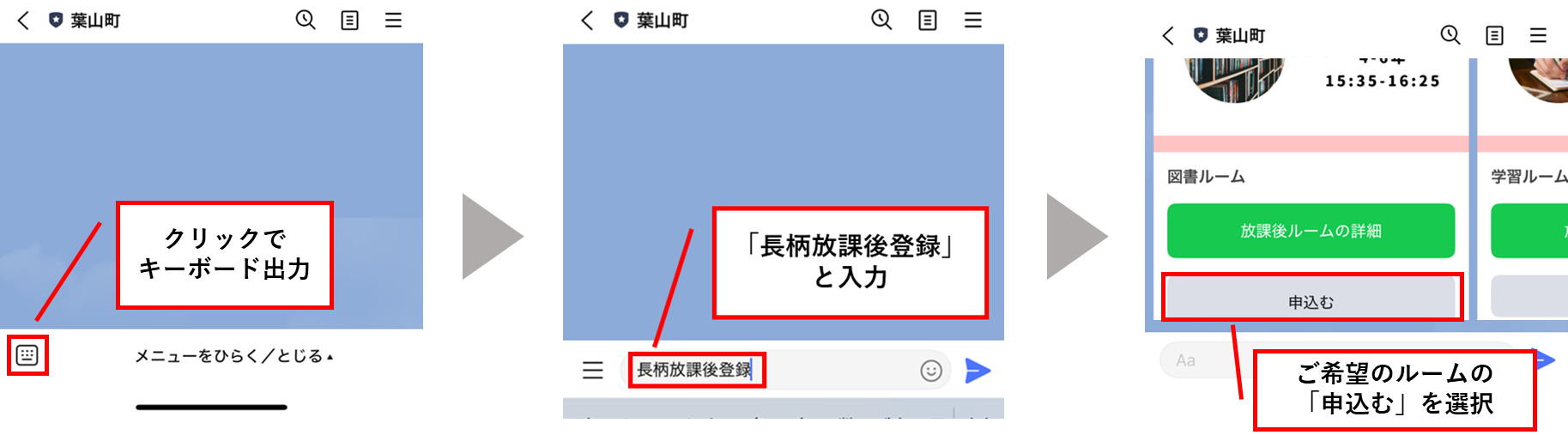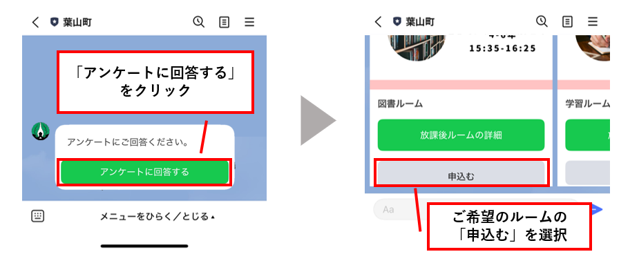 本放課後ルームへのお申し込みやご連絡は、主に葉山町公式LINEを利用しています。